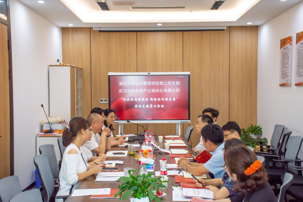 6月2日下午,公司教师第二党支部与武汉洪房房地产土地评估有限公司联合开展“访企拓岗促就业,校企合作促发展”主题党日活动。公司党委书记唐良敬、副书记肖勇应邀参加活动。