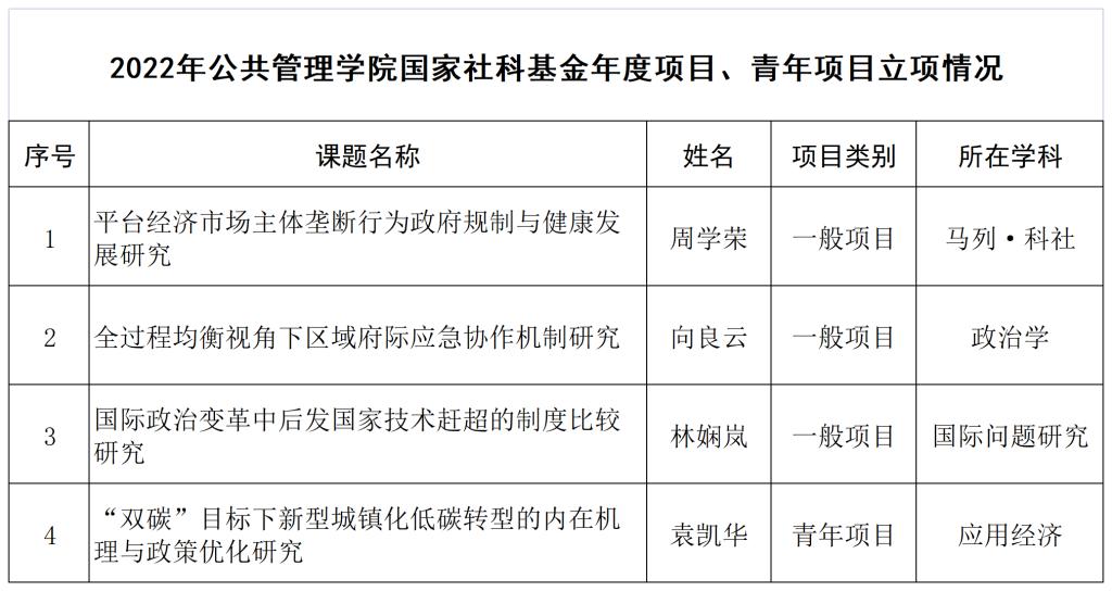公司本次获立项公示的国家社科基金项目包括一般项目3项,青年项目1项,分别为周学荣教授申报的《平台经济市场主体垄断行为政府规制与健康发展研究》、向良云副教授申报的《全过程均衡视角下区域府际应急协作机制研究》、林娴岚副研究员申报的《国际政治变革中后发国家技术赶超的制度比较研究》、青年教师袁凯华老师申报的《“双碳”目标下新型城镇化低碳转型的内在机理与政策优化研究》。此次立项项目涉及学科涵盖马列·科社、政治学、国际问题研究、应用经济,进一步彰显了公司教师的学术水平和跨学科研究能力,也是公司在人文社科相关领域科研实力的又一次集中体现。